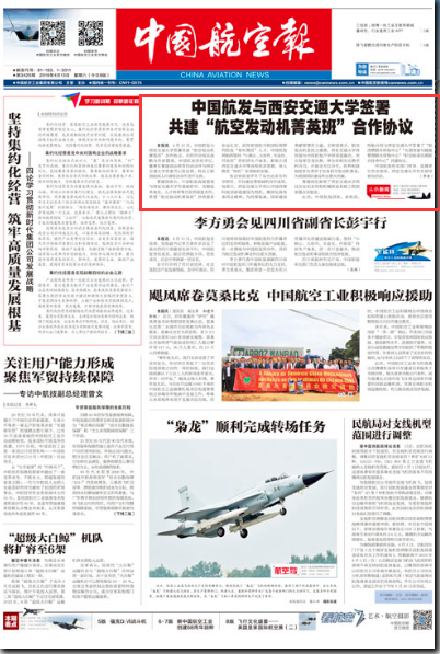 【中国航空报头版】中国航发与西安交大签署共建“航空发动机菁英班”合...2019-04-17