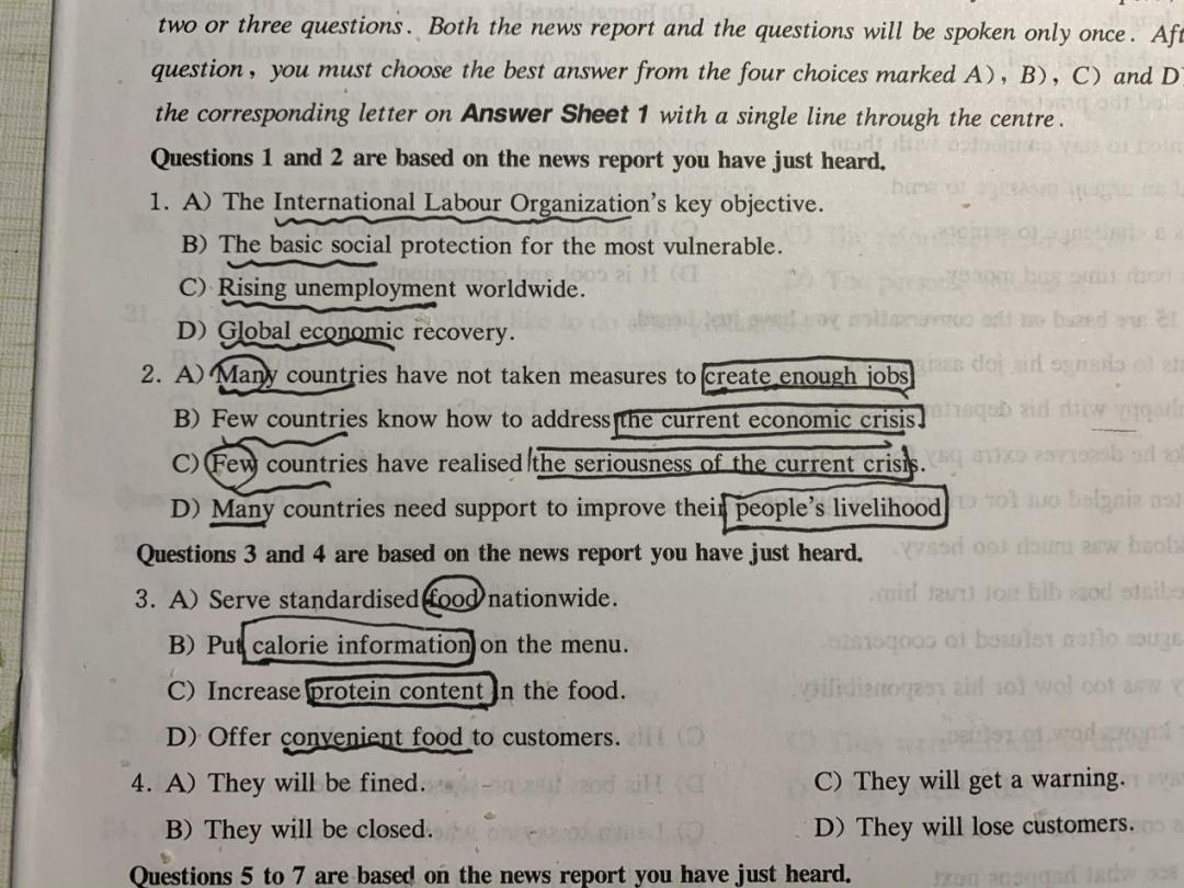 对于听力来说有很多值得注意的点。首先,对于听力整体来说,不可能存在一字一词完全听懂的情况,所以只需听关键词,理解大概意思,做题一般不会有太大困难。然后,在开始听之前,会有一段本小节的介绍,在这段时间里,可以提前观看选项,圈出关键词,这样在听的时候会有很大帮助。对于有些选项结构大致一样的题目可以先圈出他们存在差异的地方,然后在听的时候注意听是否有这些关键词的出现。如果有,则选择相应选项,当然这个方法并不是任何时候都适用,其前后文可能会存在一定差异,所以最终还是要依据听到的原文进行判断。