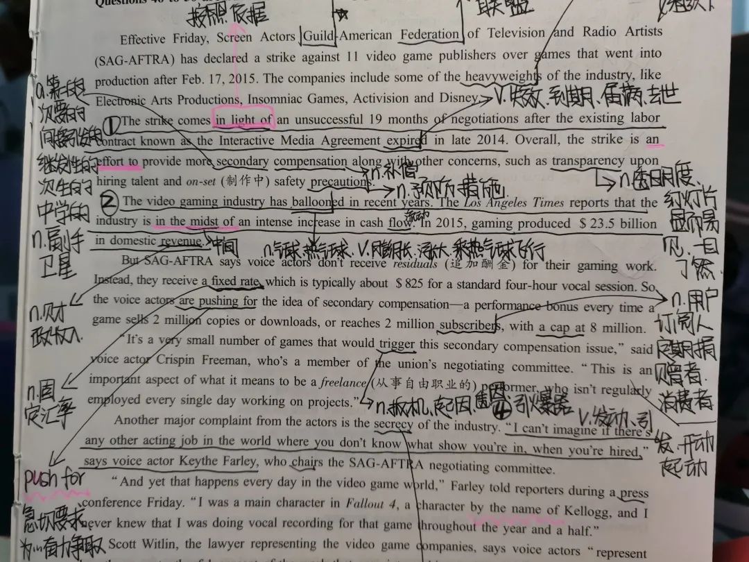 2.学会精读:平时阅读练习不要只是简单的统计一下正确率,按照解析找答案出处。推荐同学们在做完题后,回过头来进行精读。具体步骤就是梳理整篇文章脉络,划分结构,整理文章的生词(结合文章语境了解用法,加深记忆),尤其关注文章中的一些转折词还有过渡句(往往是出题点),这个过程你也可以学习写作思路,文章如何进行过渡,以及在特定语境中单词的地道表达。