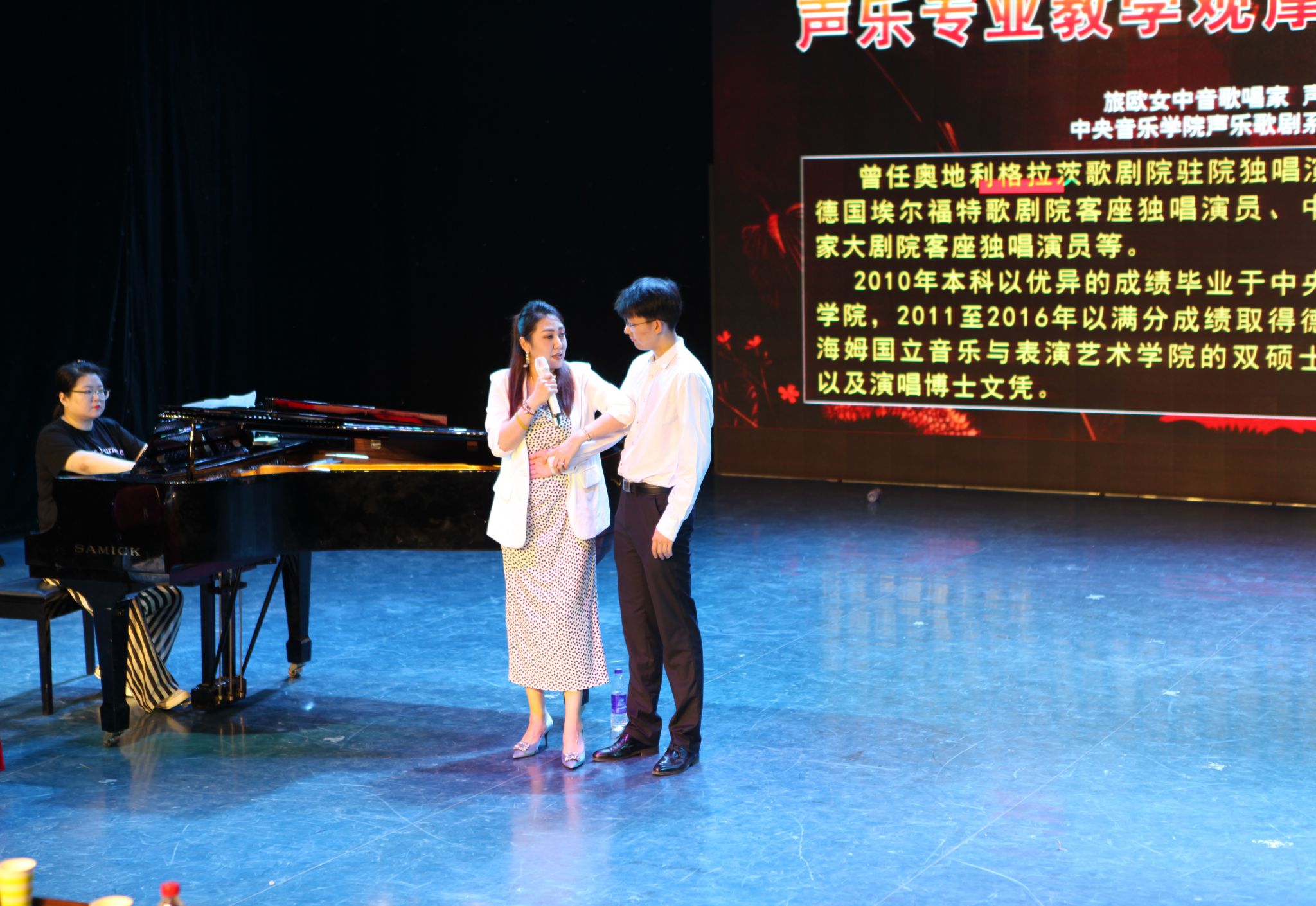 参加观摩课并演唱的学生分别为2020级张明天、王辰琰,2021级崔一凡、陈倩莹。张媛副教授从歌曲、气息、歌唱位置、发音等方面,知无不言,言无不尽,为学生进行详细的声乐指导,学生在短时间内比较好的吸收了建议,呈现出极好的反馈,张媛副教授通过传授自身扎实丰富的舞台表演经验、精准的对学生声音的判断力和对声音技术炉火纯青的把握,在极短的教学时间内让学生感受明显的声乐变化。