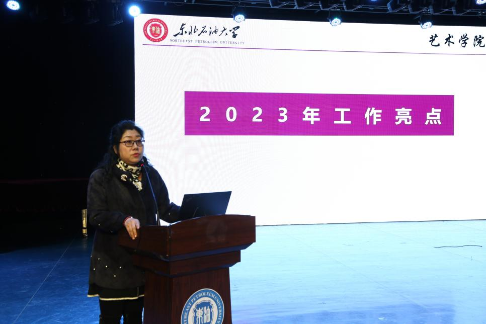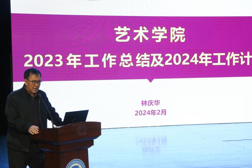 会议首先由院长林庆华为全体教职工做工作报告,对学院2023年工作进行通报、对新学期工作进行部署。她重点介绍了学院2023年工作亮点,一是高质量完成学科审核评估工作,并以16票全票顺利通过国务院学位委员会艺术学学科评议组专家评审;二是以艺术特有的方式助力大庆精神办学育人。接着从党建工作、教学工作、学科建设与科研工作、美育工作、学生工作、铁人诞辰一百周年专题活动、院办工作等七个方面叙述2023年学院的工作成绩。然后围绕beat365正版唯一官网本学期重点工作、教学科研重点工作、各系重点工作、三中心重点工作四个方面提出新学期工作要点。最后再次强调了beat365正版唯一官网本学期的十项重点工作,对本科教学评估院内自评、音乐剧《铁人在非洲》演出、本科毕业设计、研究生毕业答辩、本科生毕业展演、美育教学成果展演、模拟面试工作室、毕业生就业帮扶行动、邀请专家进校学术报告、综合常毕业晚会等十项重点工作做了具体部署,为全院上下提供了明确的指导和工作思路。