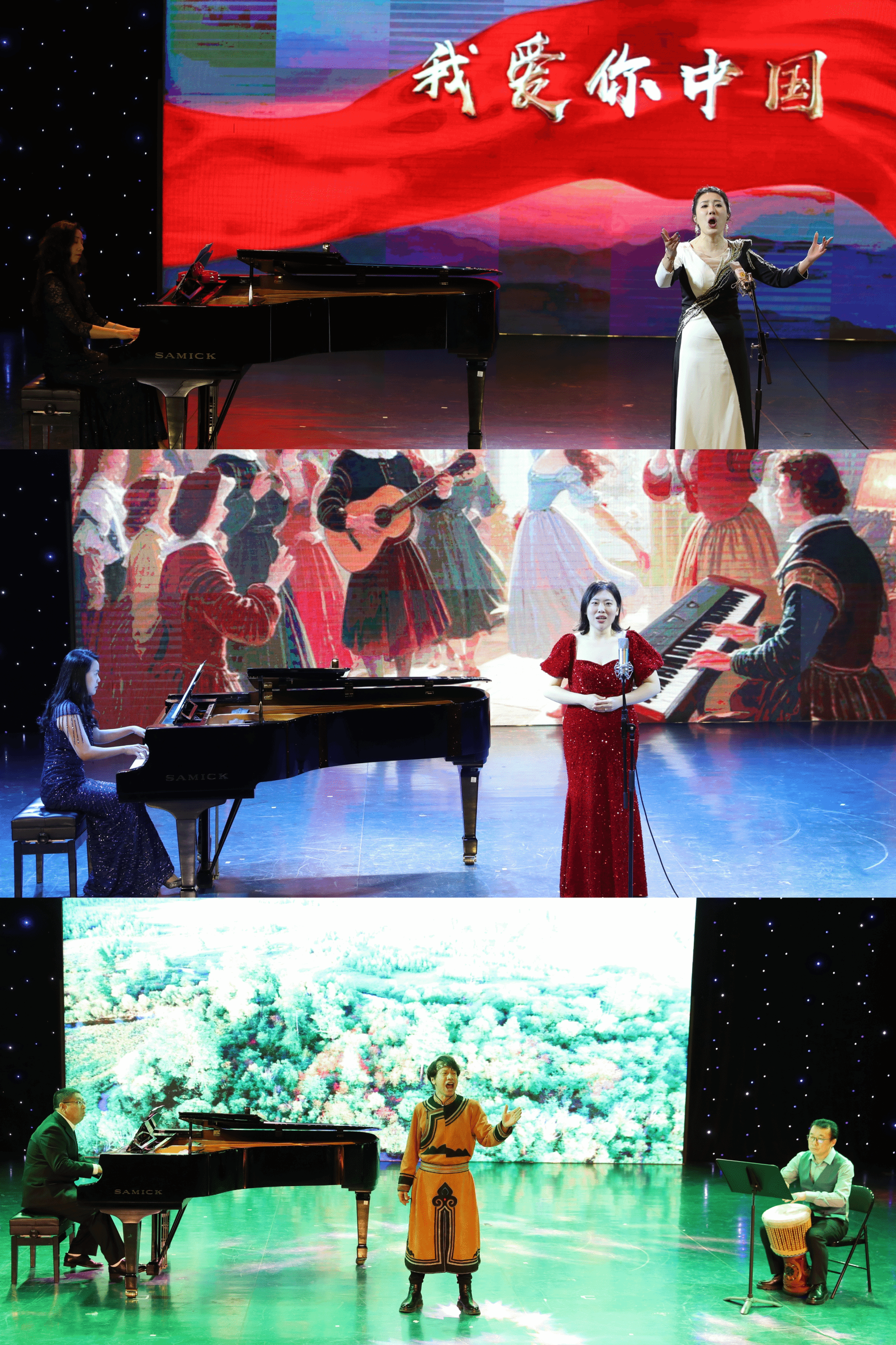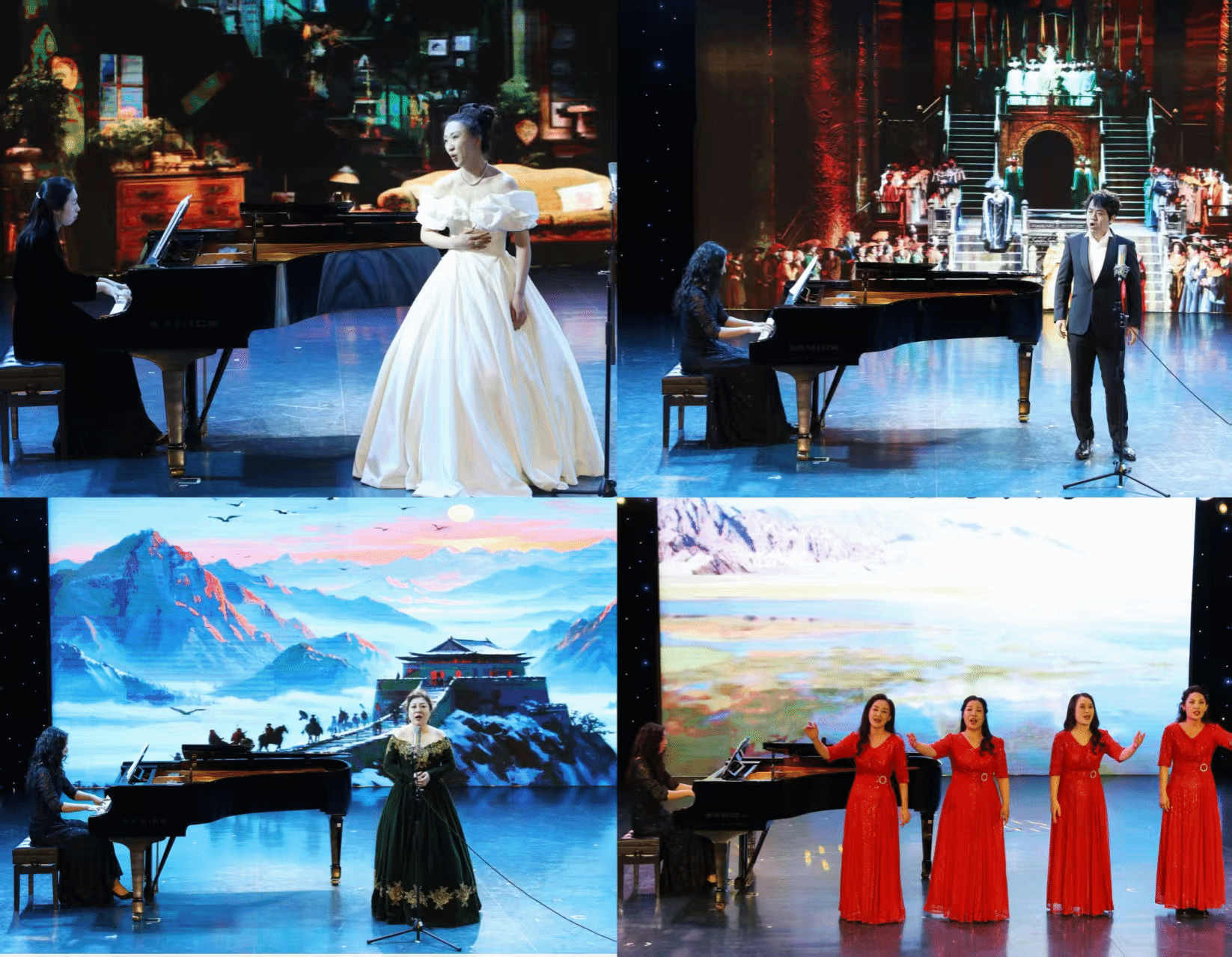 独唱《我爱你中国》美声唱腔融合戏曲甩腔;《爱音乐的人》跳跃的旋律诠释青春与热情;《山林的回声》侗族大歌重现山野天籁;《忆秦娥·娄山关》毛泽东诗词碰撞京剧吟诵跨界;咏叹调《人们叫我咪咪》《美酒消千愁》戏剧舞台表现加持精准气息控制;重唱《青春舞曲》多声部卡农式交叠爵士和声。