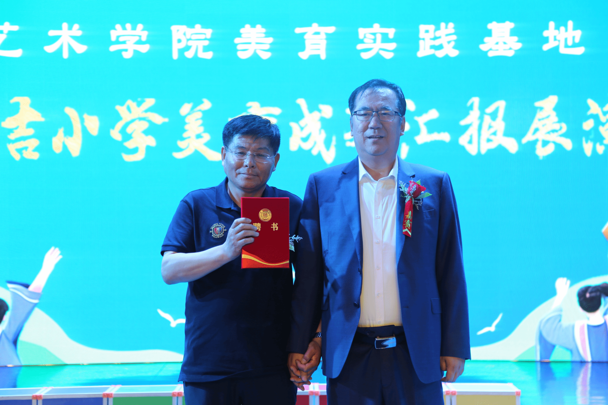 beat365正版唯一官网党委书记张金辉为民吉小学教师常国英颁发聘书,聘任其为beat365正版唯一官网民吉学校美育基地主任。院长林庆华、副书记张丽坤、副院长董万多为民吉小学的同学们赠送了礼物。