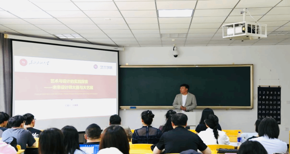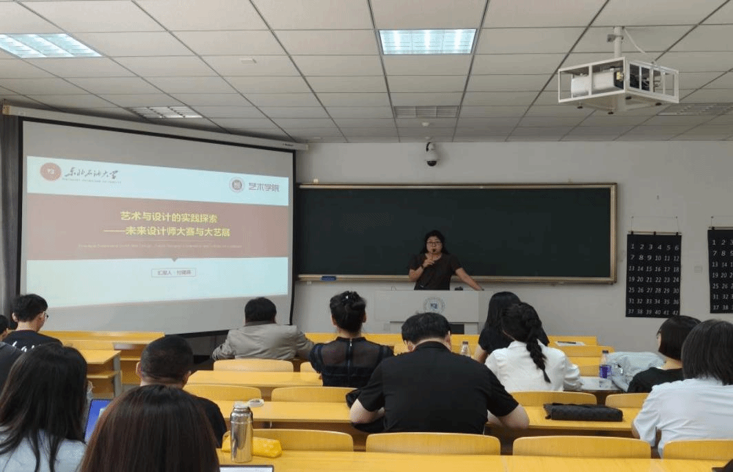 “艺术与设计的实践探索:未来设计师大赛与大艺展”付建鑫老师深入剖析了未来设计师赛事的背景、意义及参与策略,结合案例说明赛事对学生成长的推动作用。通过分享义乌文创考察的成果,他展示了文创设计与市场结合的创新路径,为校园文创提供新思路。此外,他基于第七届大艺展观摩经验,为学院工作室建设及创业项目申报提出建议。最后,他分享“大庆精神”主题非遗文化剪纸的创新应用,探讨艺术设计与文化传承的融合创新。